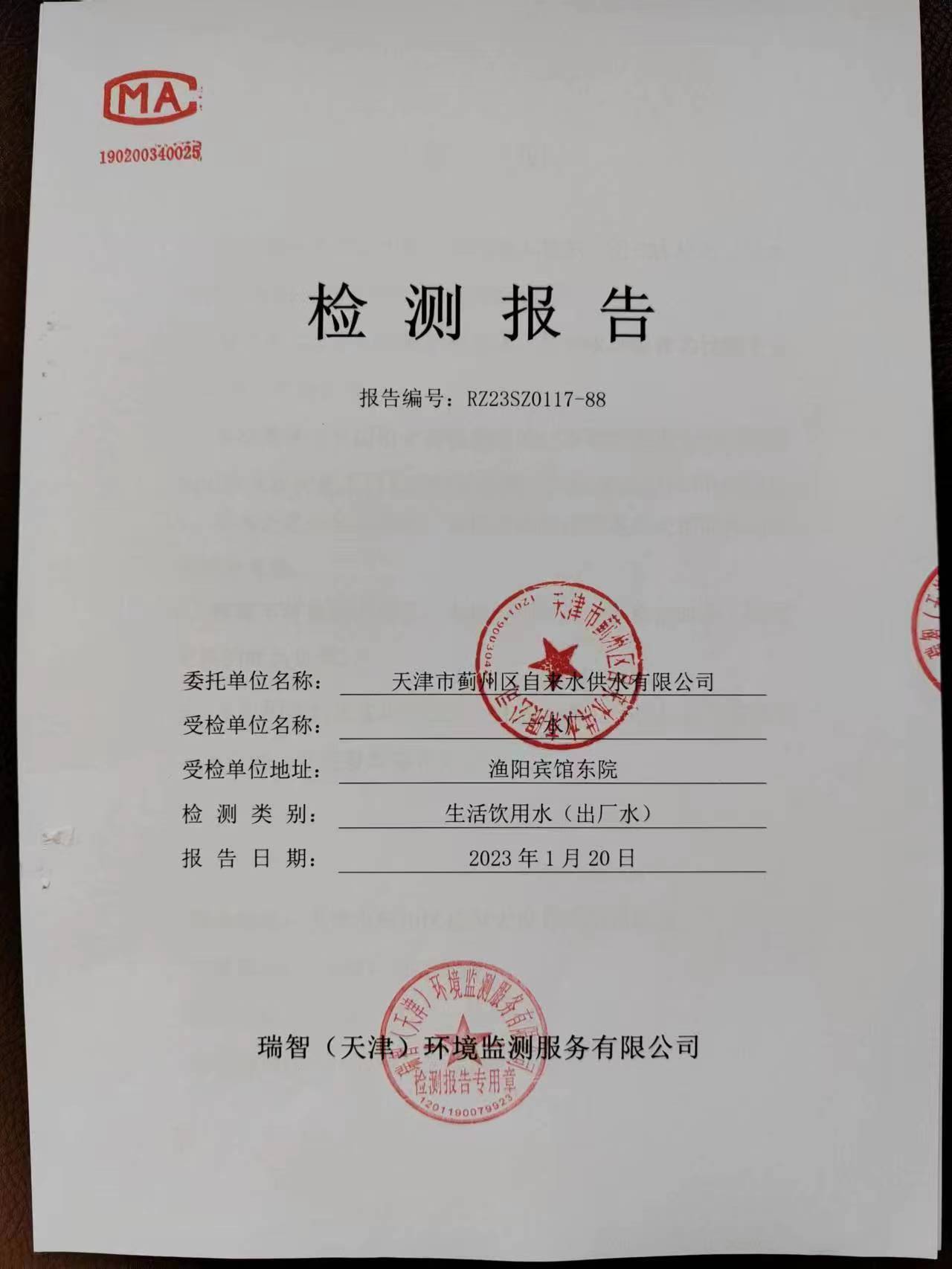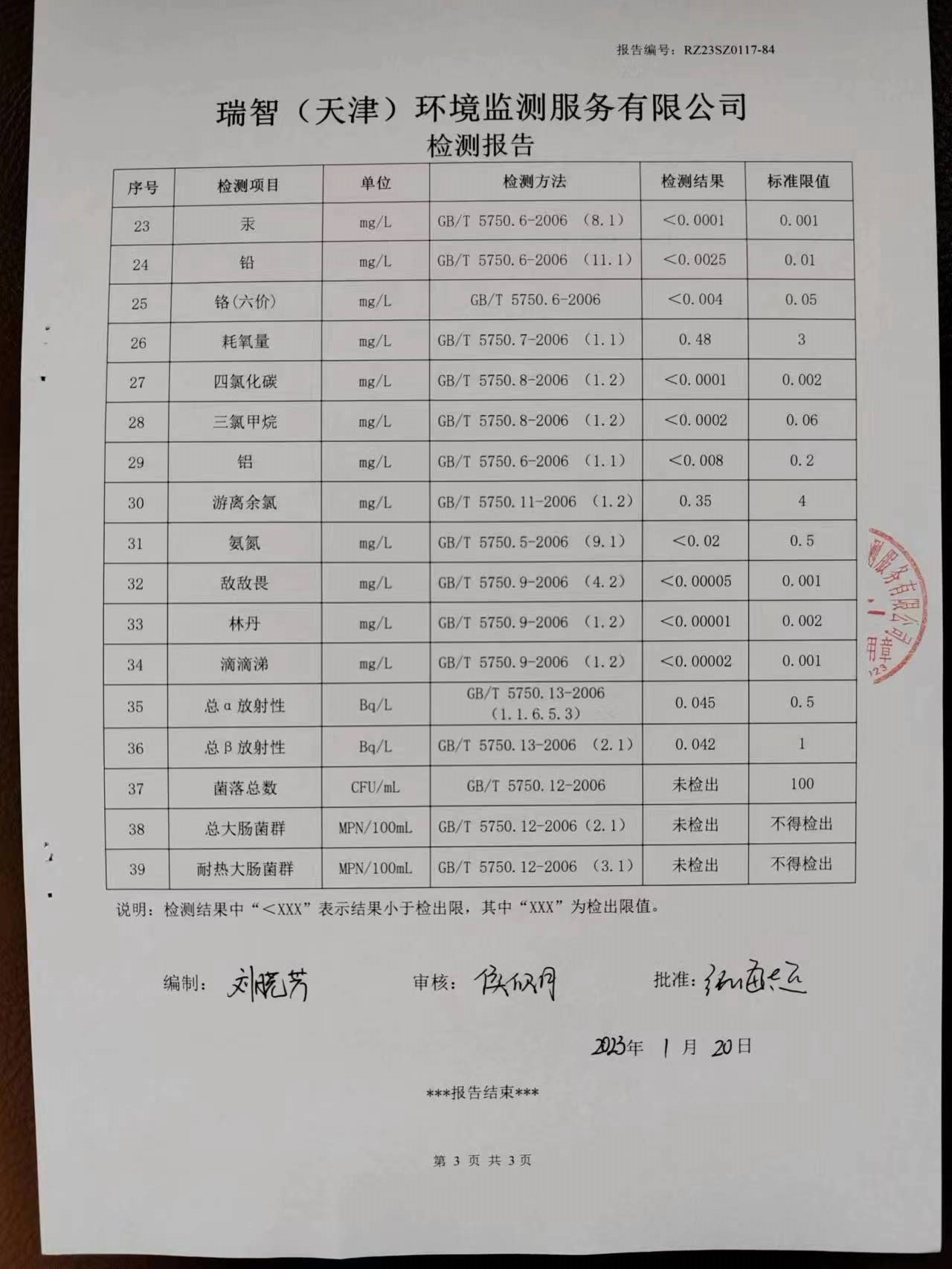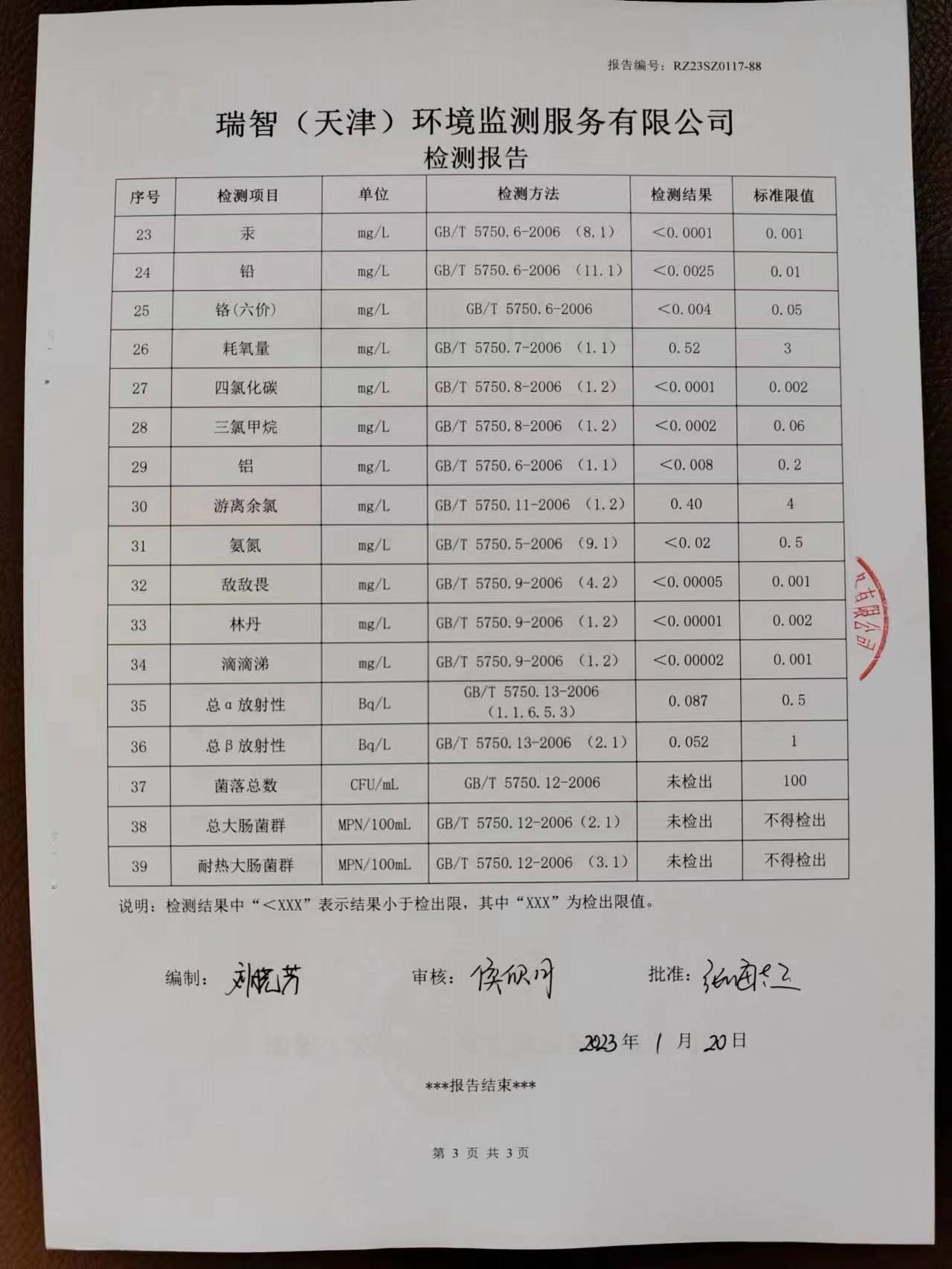 2023年1月份水質(zhì)檢測報告