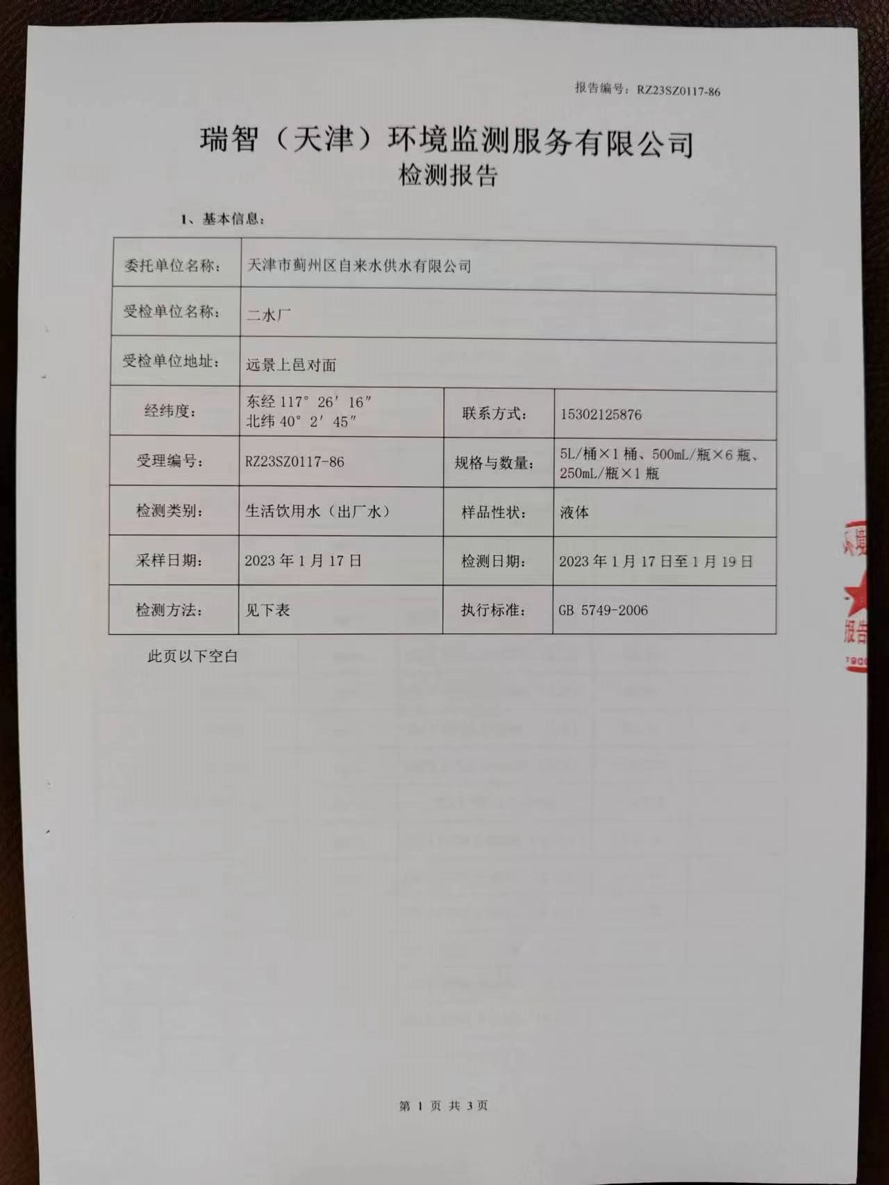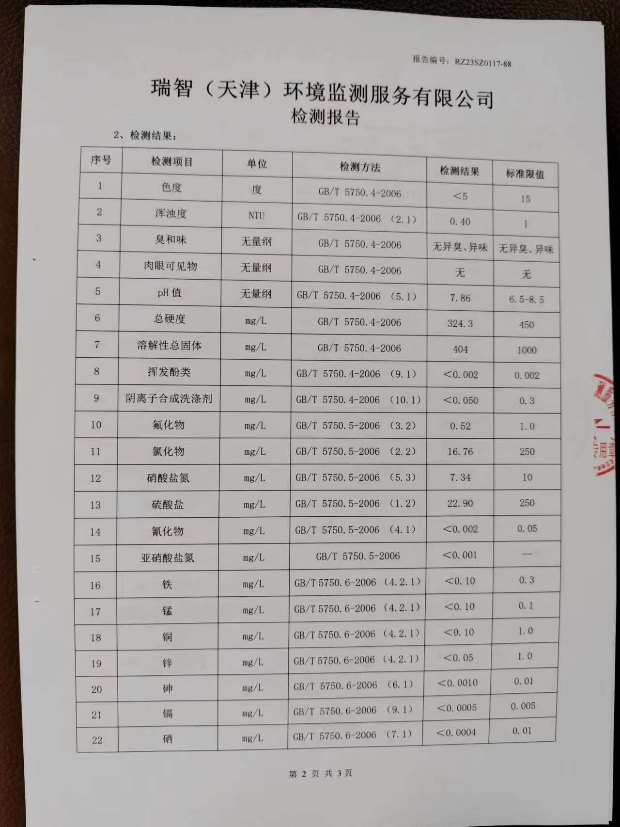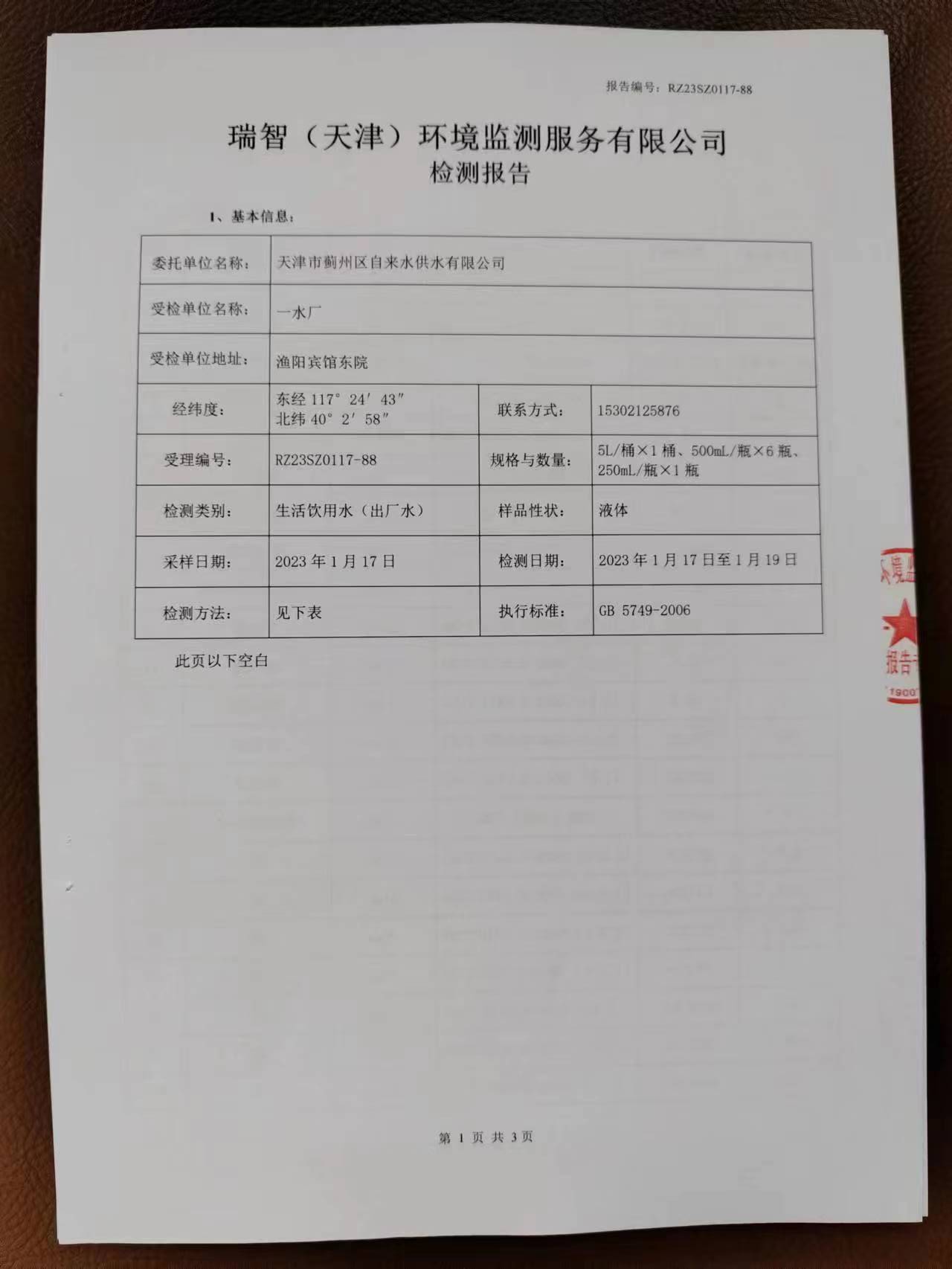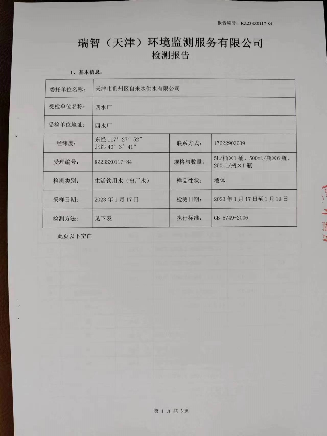 2023年1月份水質(zhì)檢測報告